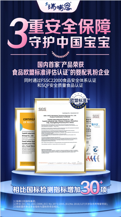 秉承“消費者第一第一第一”的企業(yè)價值觀,蒙牛瑞哺恩對標(biāo)全球最嚴(yán)標(biāo)準(zhǔn),全面啟動歐盟標(biāo)準(zhǔn)升級,憑借著高標(biāo)準(zhǔn)、嚴(yán)要求,瑞哺恩國內(nèi)4家工廠均順利拿下國際權(quán)威認證機構(gòu)SGS授予的歐盟食品標(biāo)準(zhǔn)認證,蒙牛瑞哺恩更成為國內(nèi)首款通過食品歐盟標(biāo)準(zhǔn)評估認證的嬰配乳粉產(chǎn)品,同時還獲得SGS授予的FSSC2200食品安全體系認證和SQF食品安全質(zhì)量認證,代表著蒙牛瑞哺恩旗下的嬰幼兒配方奶粉的生產(chǎn)已達到國際一流水平。